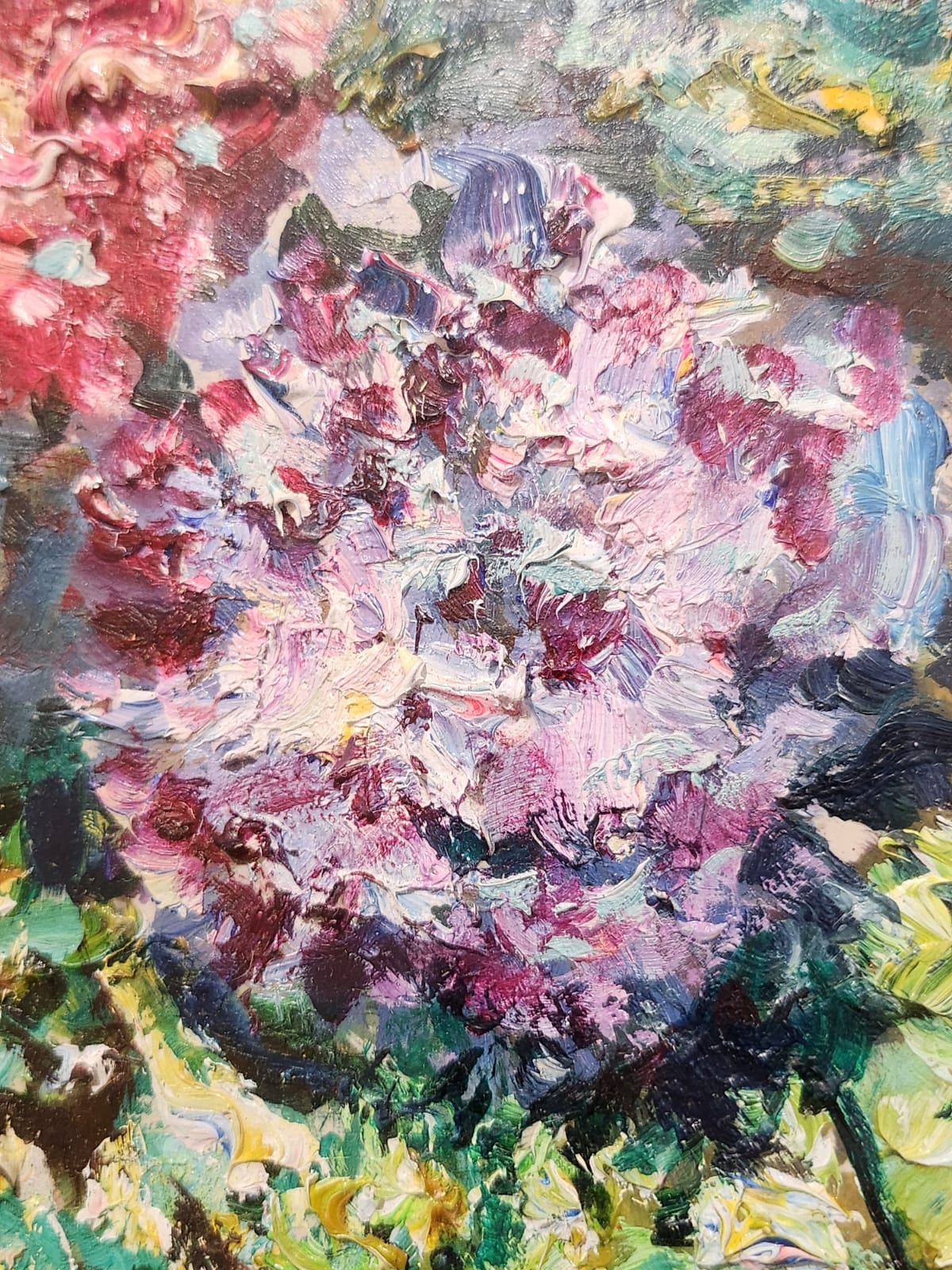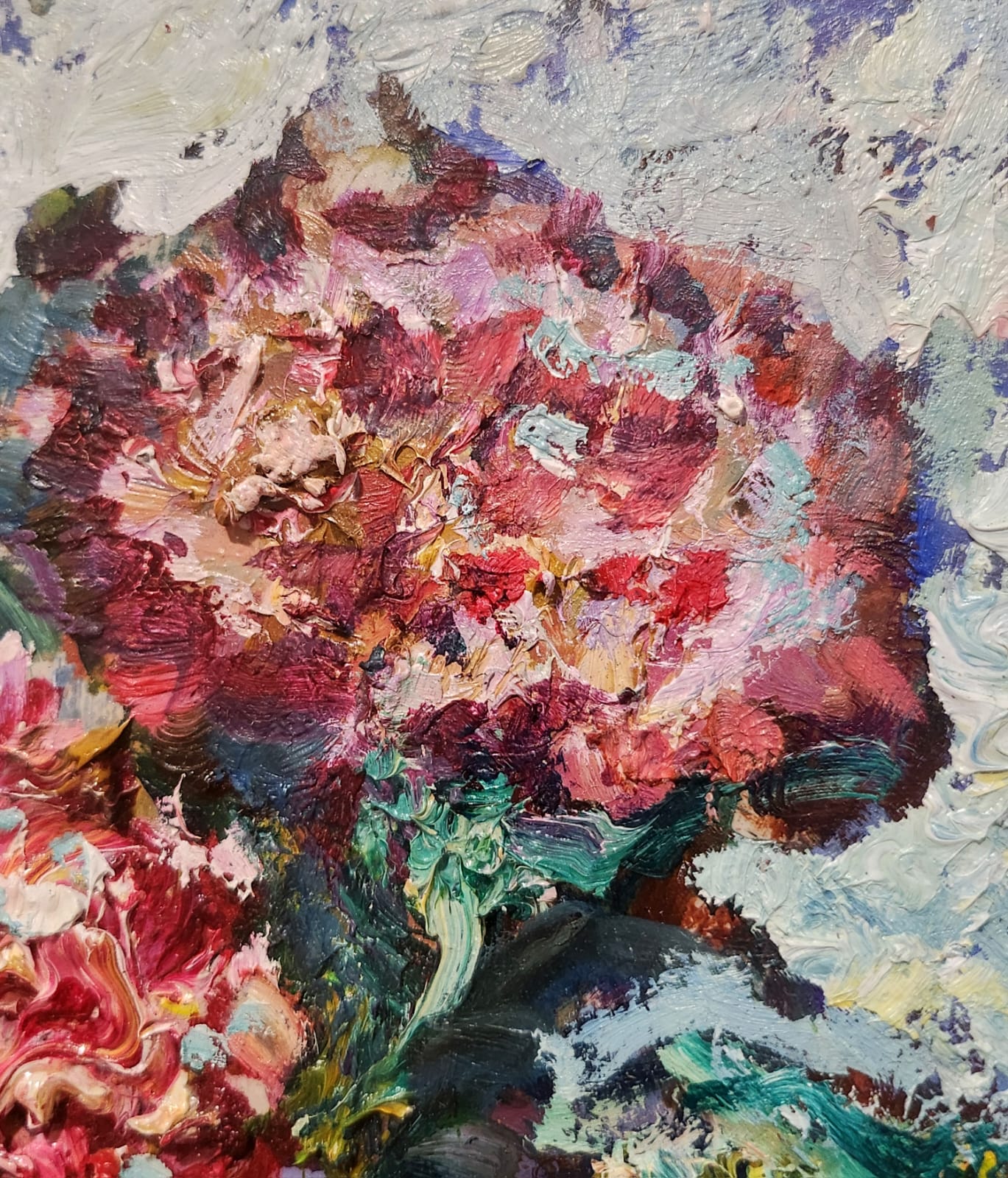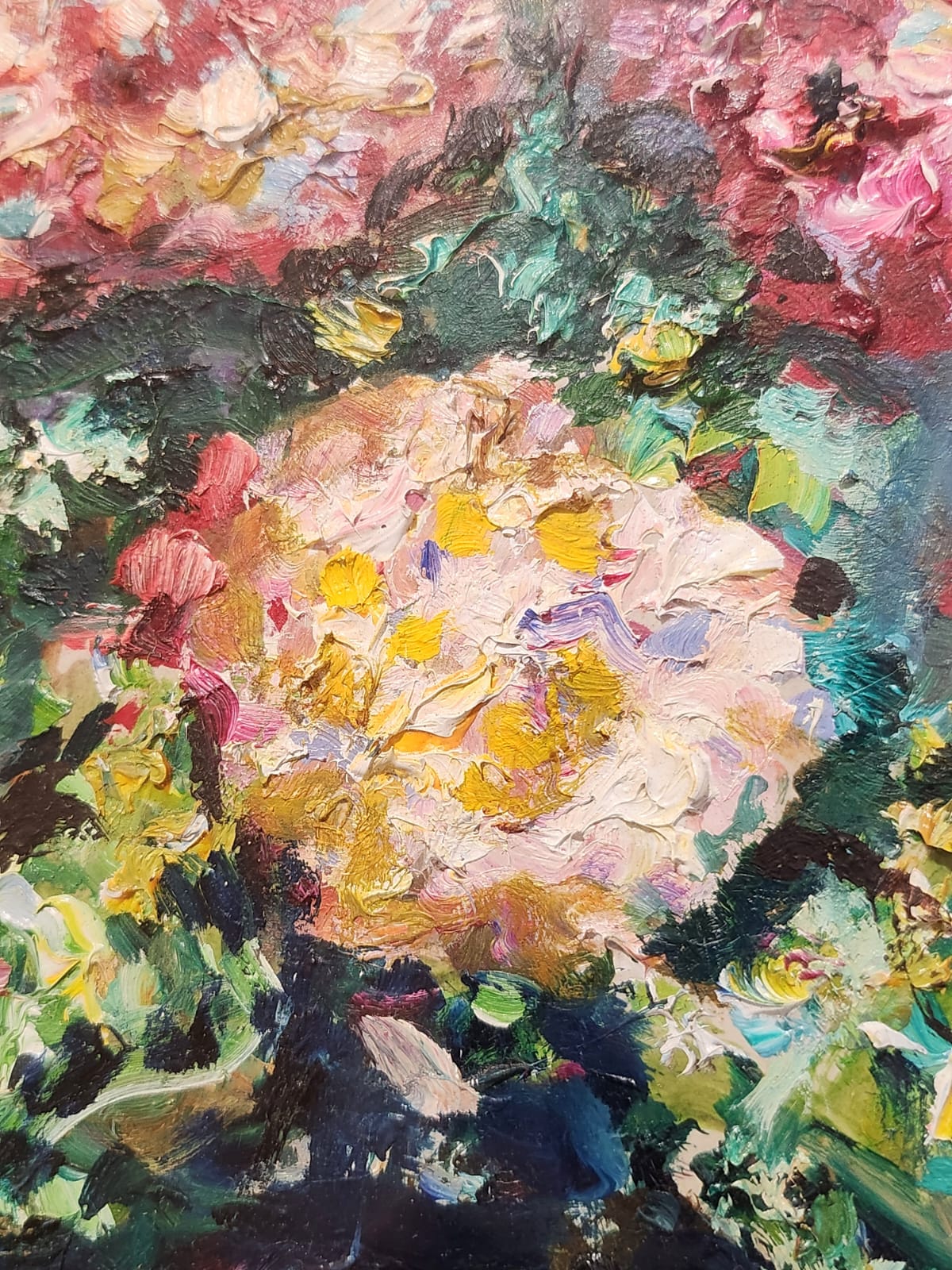 This sense of vibrancy is undoubtedly also due to the type of flowers chosen, which are so full of petals and leaves; they are probably gerberas and carnations.