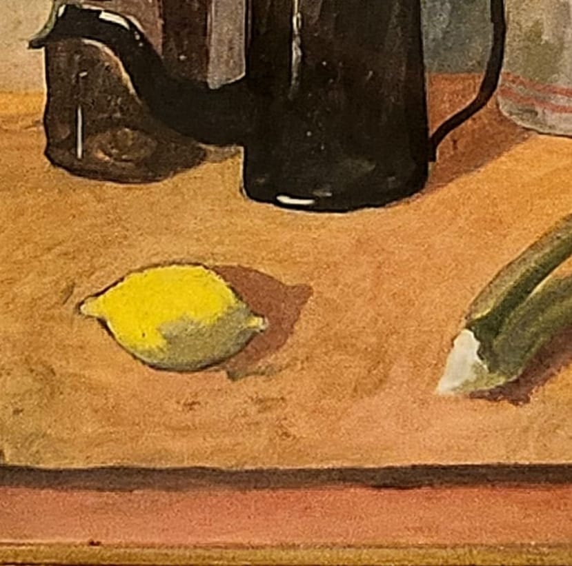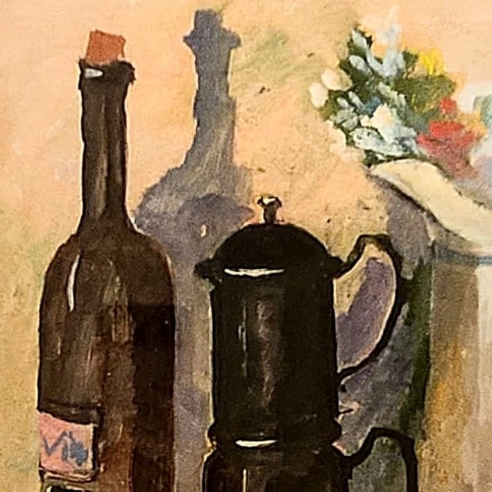 I fiori posti nel vaso che sembrano morbidamente mescolarsi al color glicine che descrive l’ombra proiettata del soggetto sulla parete di sfondo.