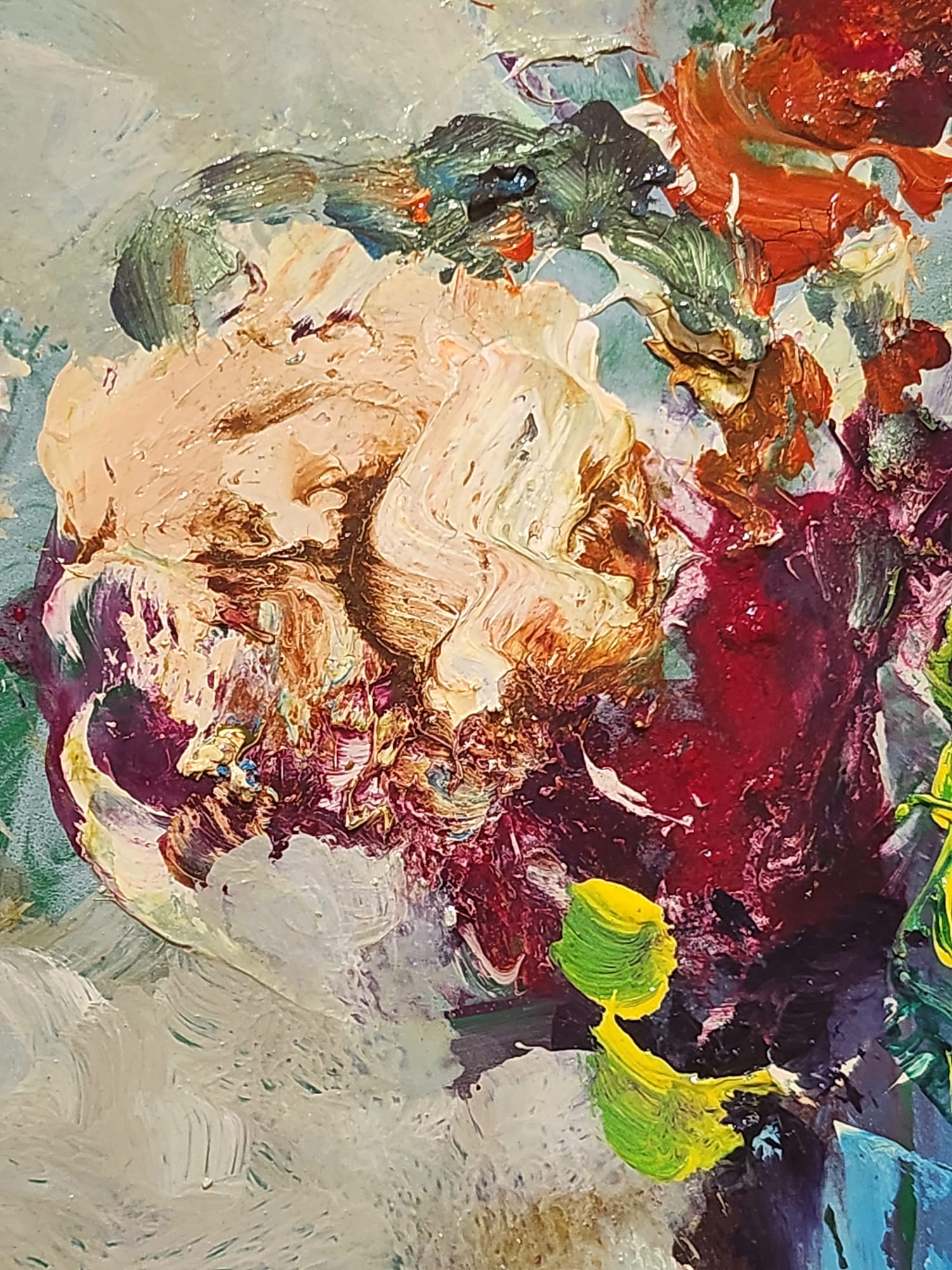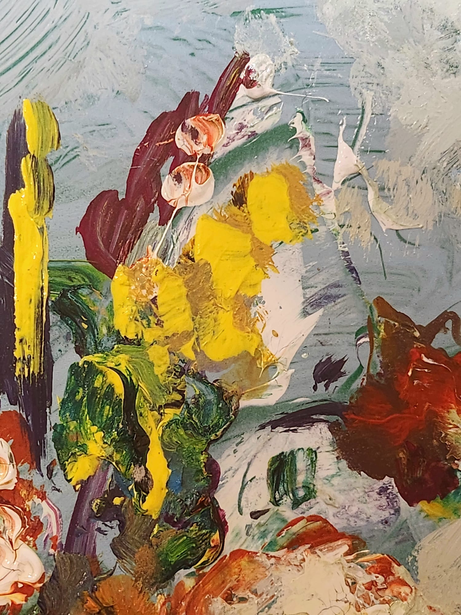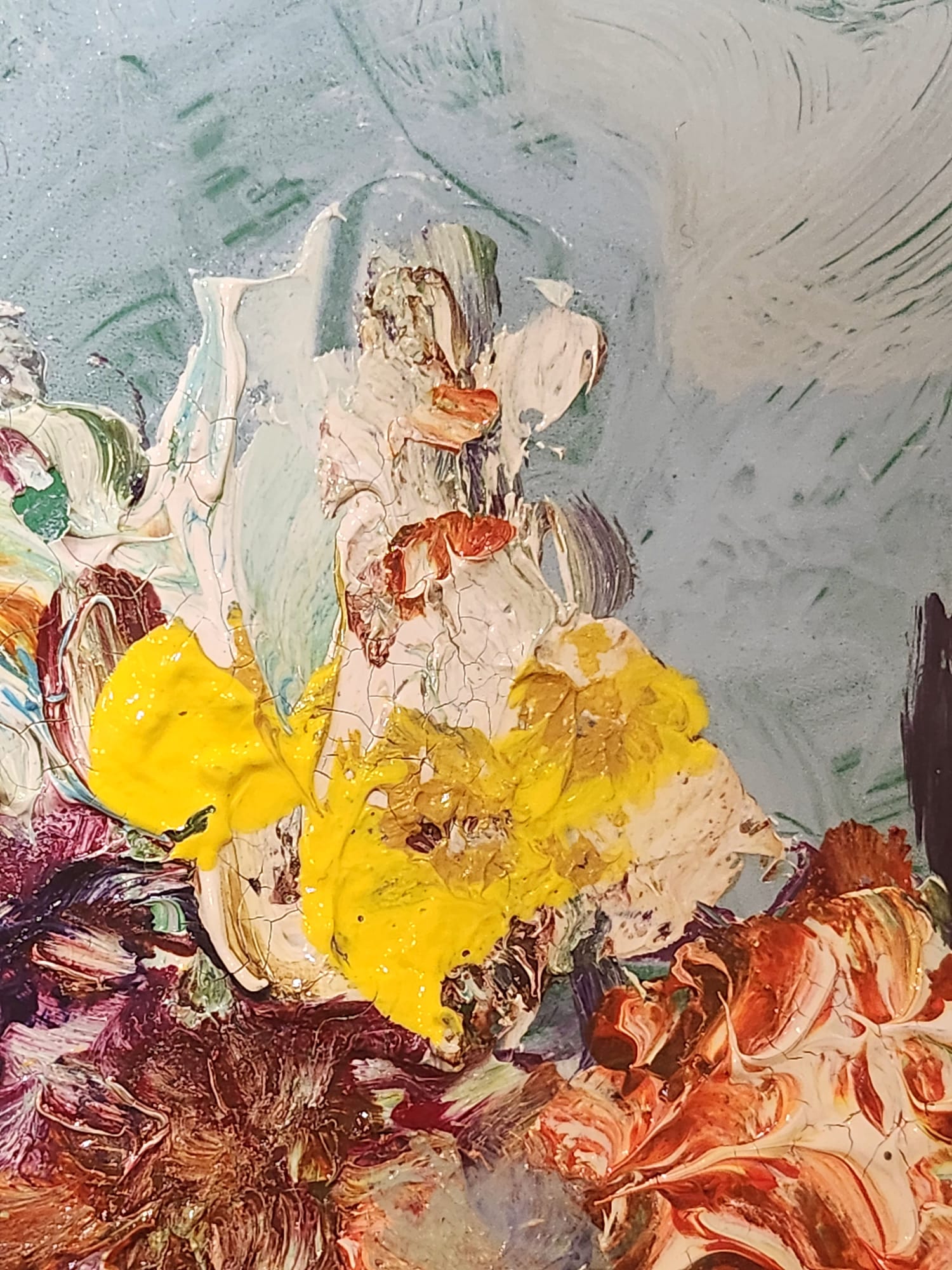 Sudden fleshiness and lumps follow one another in a dynamic succession that allows us to imagine the movement of the spatula dancing frantically on the surface.