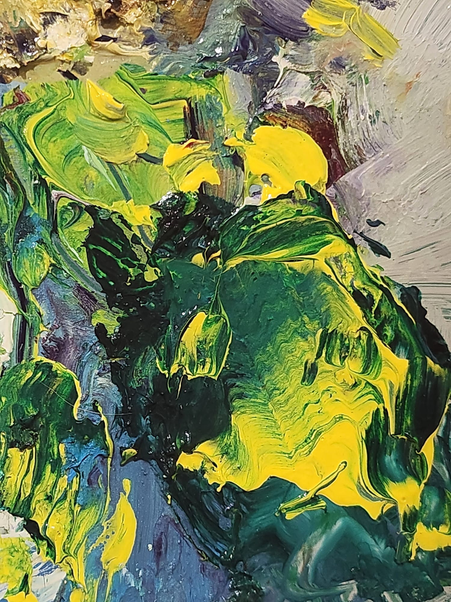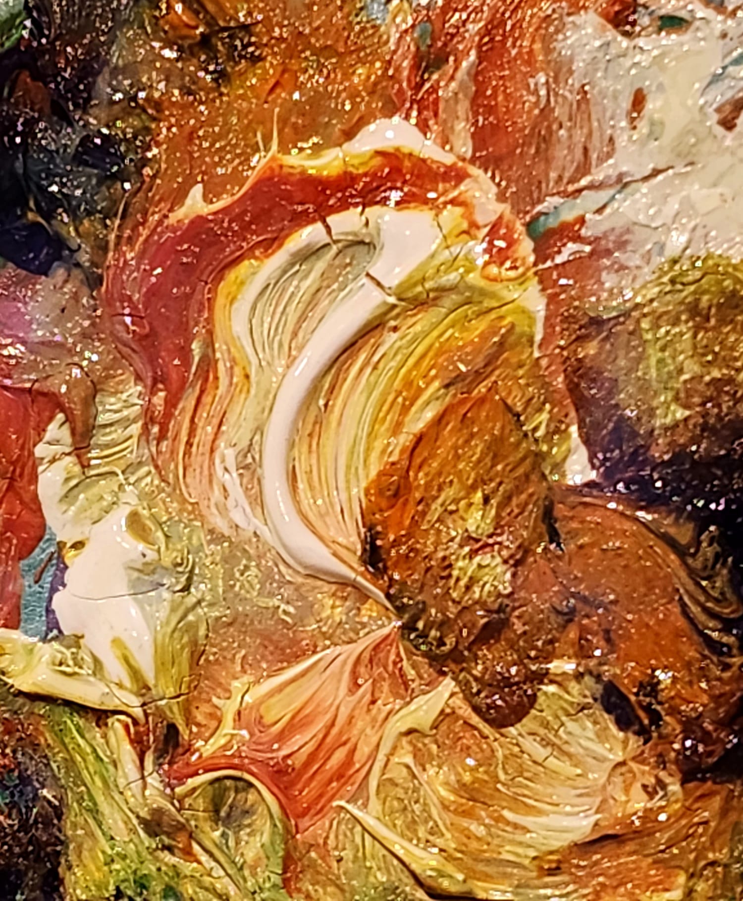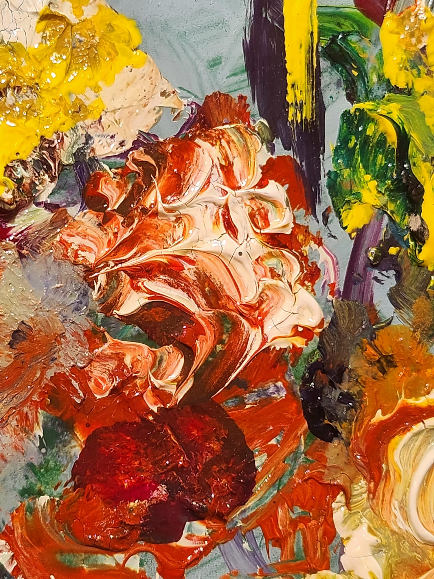 Sudden fleshiness and lumps follow one another in a dynamic succession that allows us to imagine the movement of the spatula dancing frantically on the surface.