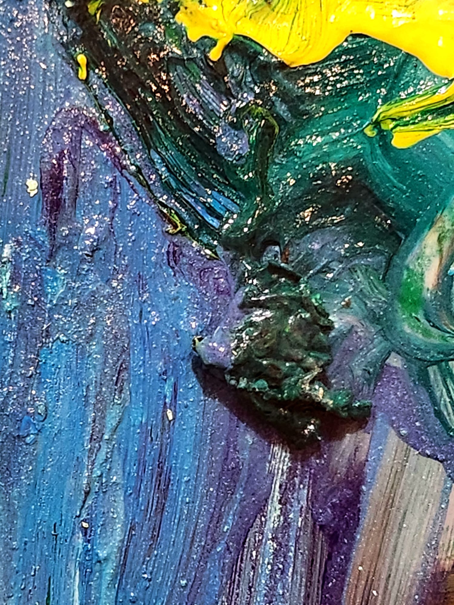 Carnosità repentine e grumi si susseguono in un avvicendamento dinamico, capaci di farci figurare il movimento stesso della spatola che danza frenetica sulla superficie.