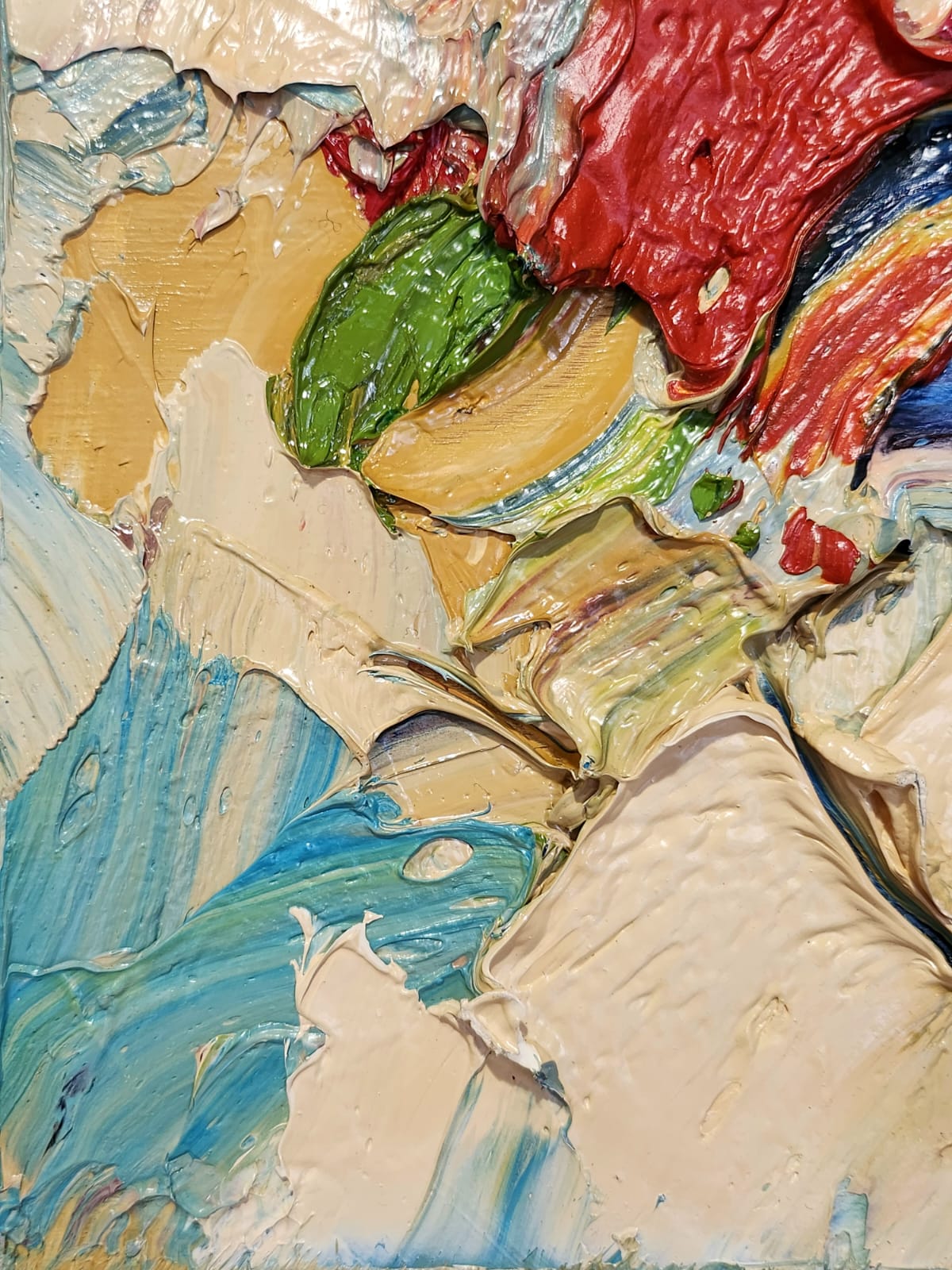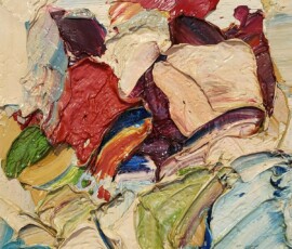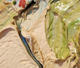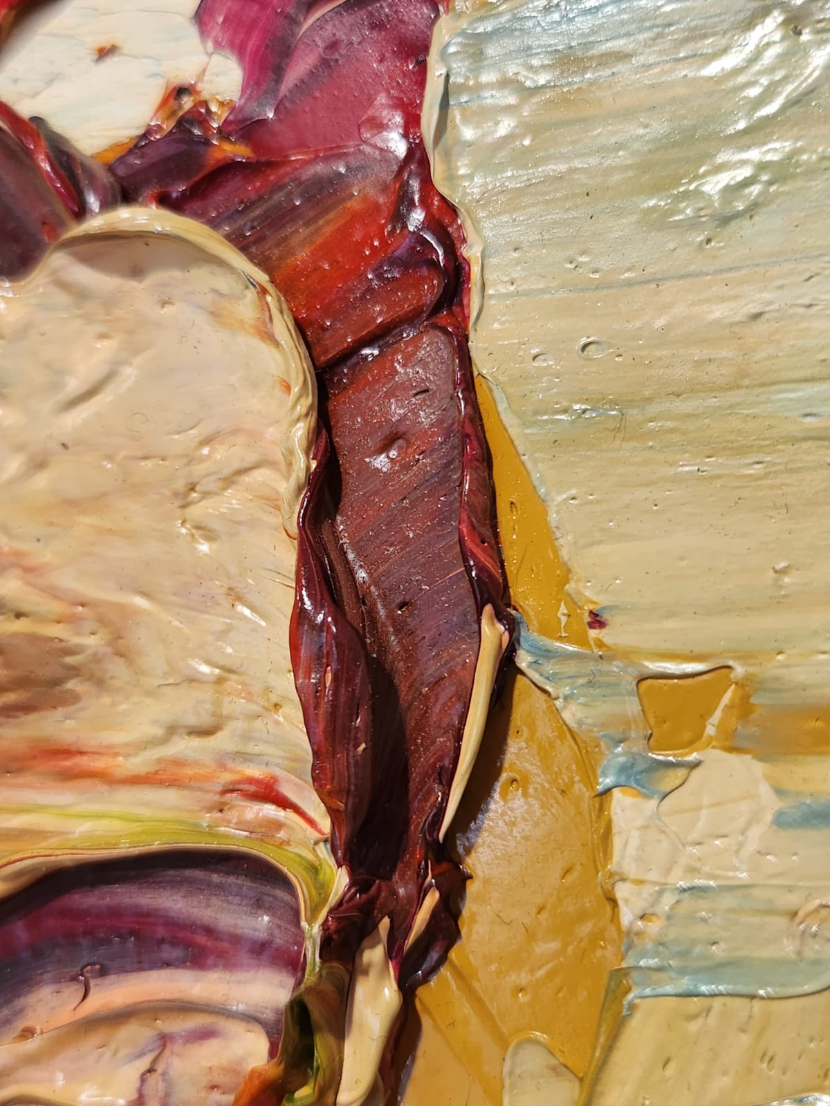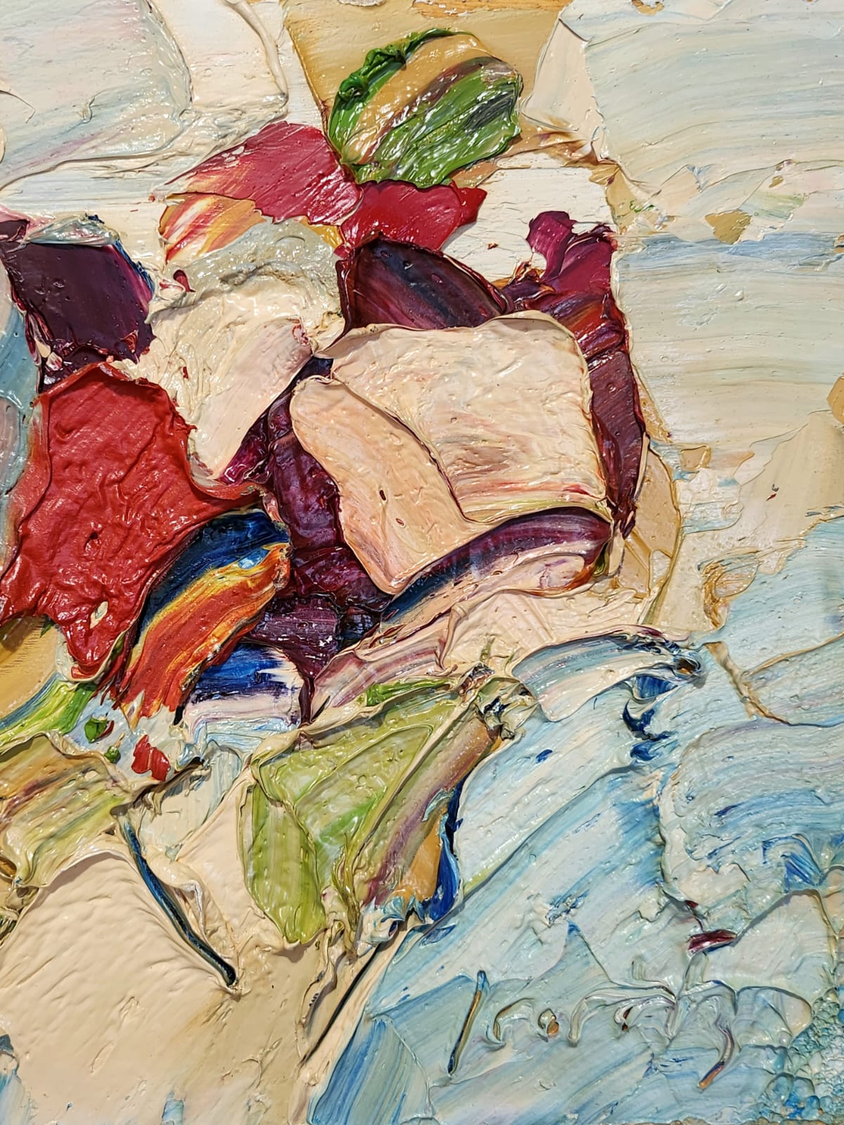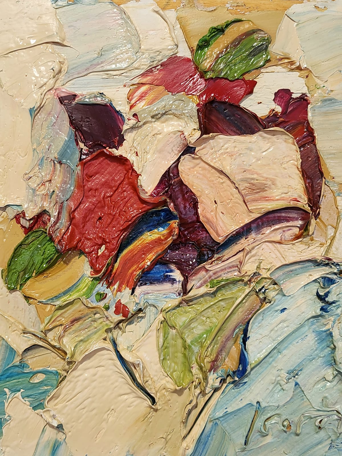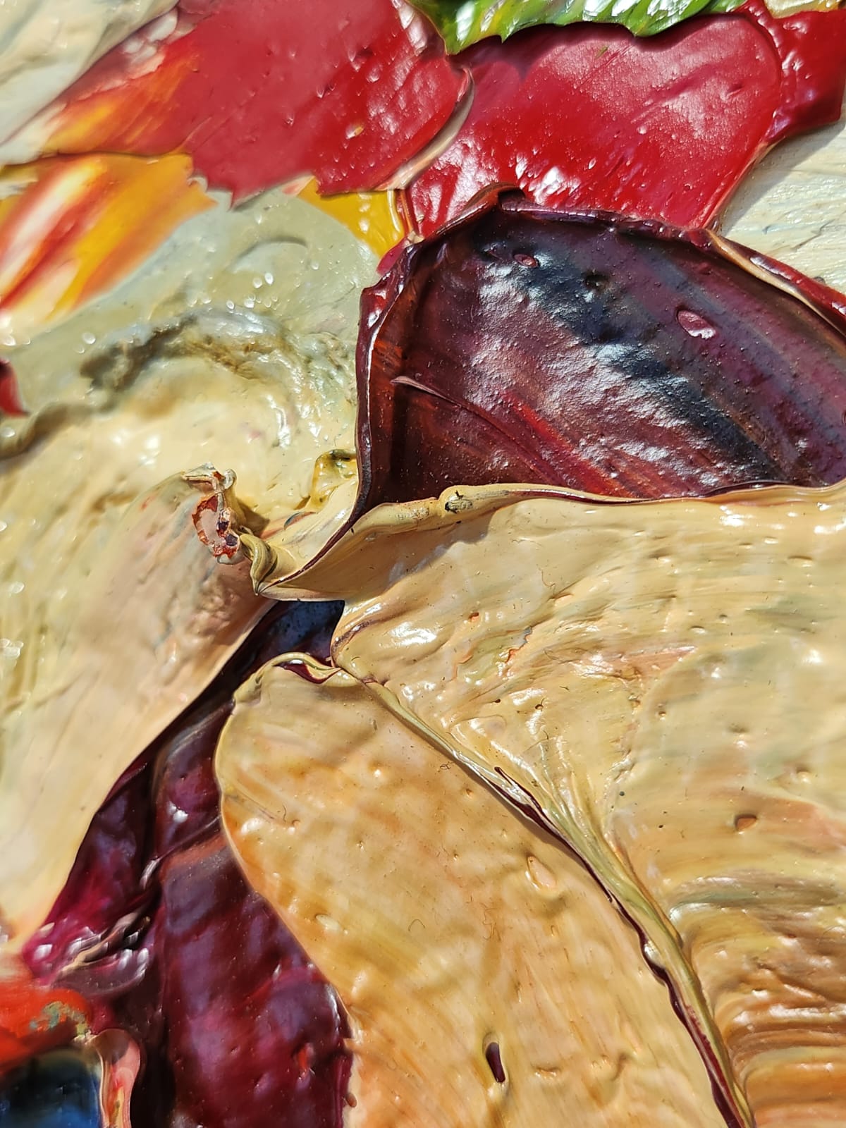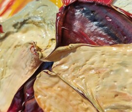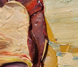 Scorgiamo però una parvenza di petali e di foglie, una pastosità stratificata assolutamente dirompente.