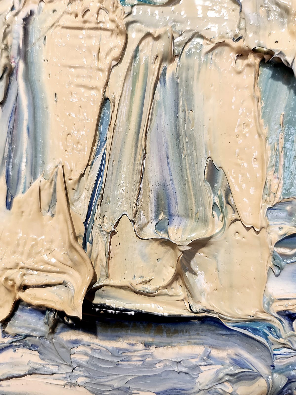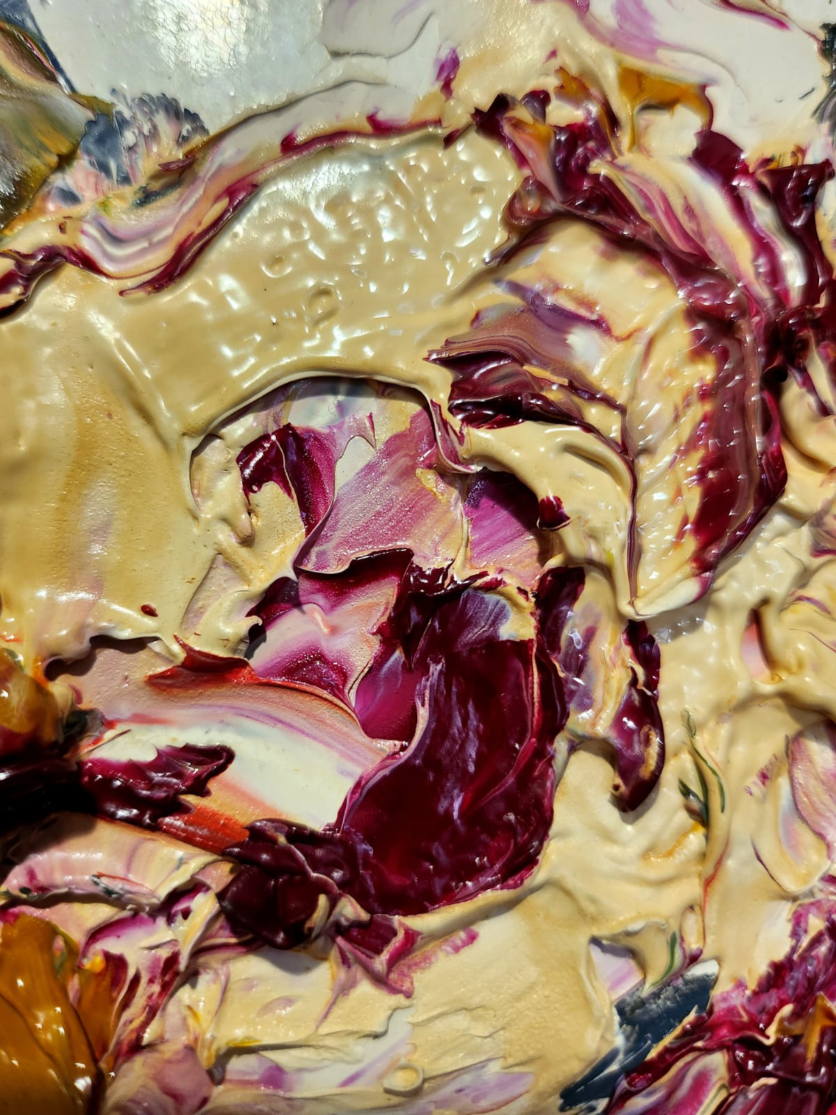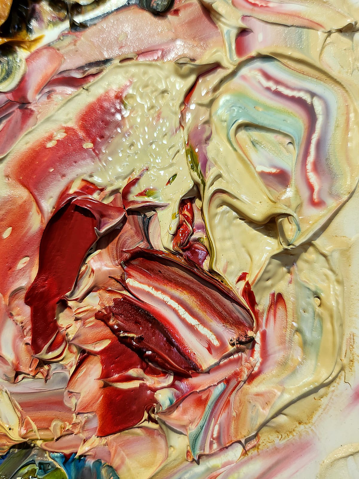 Le spatolate creano e disciplinano grumi di colore improvvisi, riuscendone a stabilire un redivivo rigore dato da un disegno meramente immaginato ed al contempo mutabile, frutto dell’opportunità compositiva figlia unicamente di un divenire fluido e senza costrizioni.