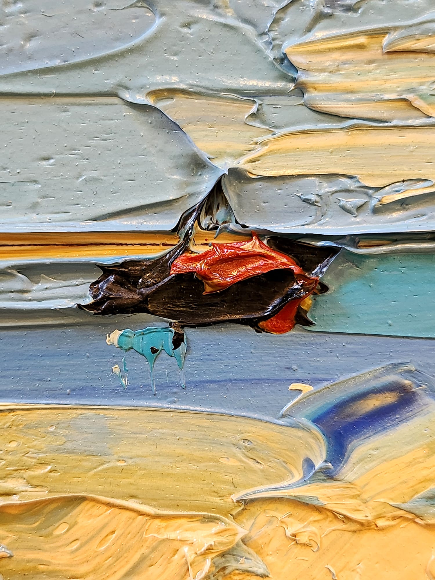 This precise preference in the palette leads to a counterbalance from a gestural point of view, opening up the whole to a dynamism that we could define as “onomatopoeic”, as the waves, the undertow and the movement of the small boat are imitated very well.