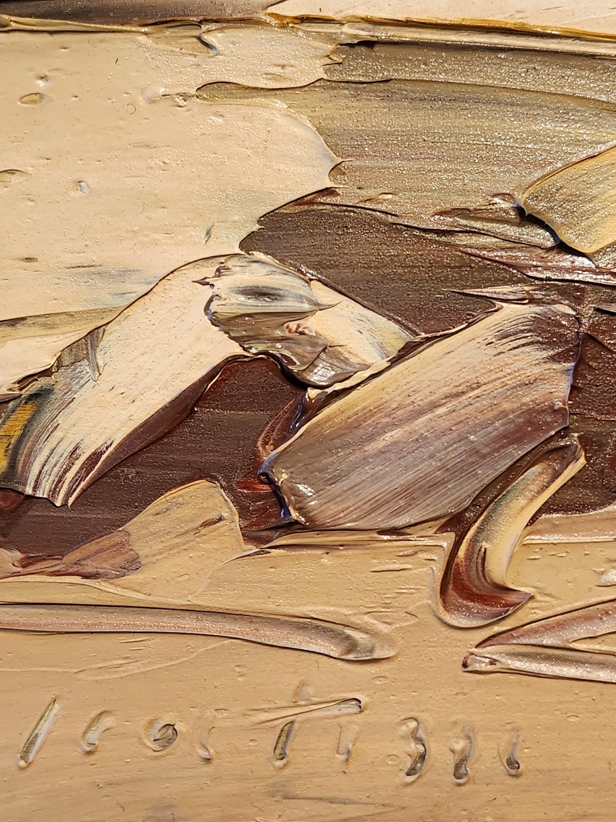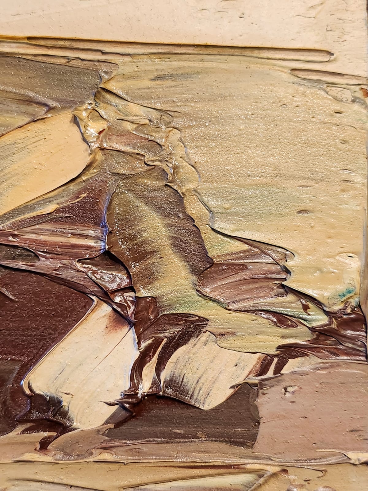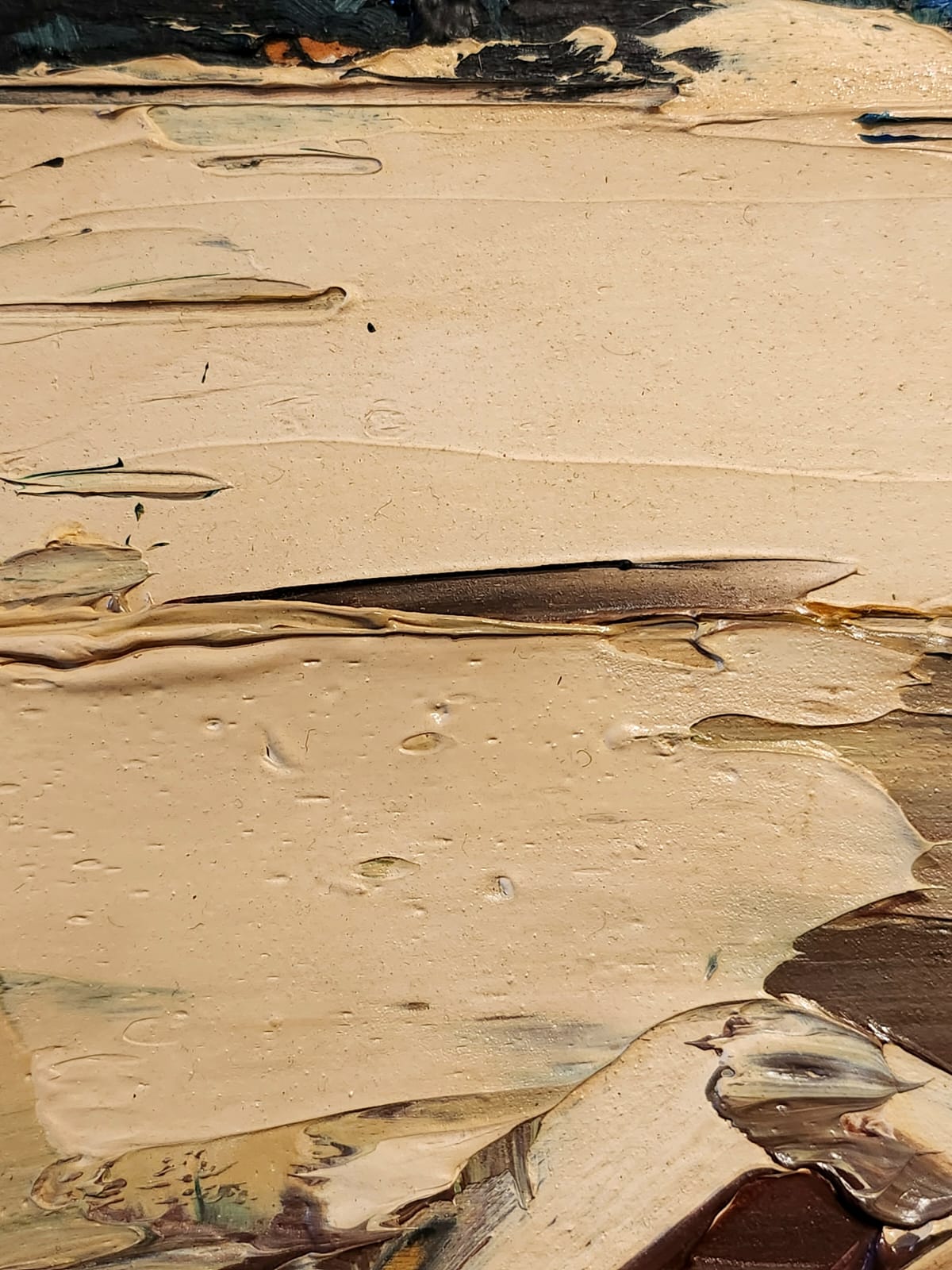 Qui troviamo perciò la terra, fertile e scura, che si unisce in primo piano al candore dorato dell’erba ingiallita dal sole.