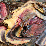 Possiamo facilmente osservare come quelle che paiono pesche aperte mostrino il loro tipico colore aranciato e lo sfumare verso il porpora nella parte attaccata al nocciolo.