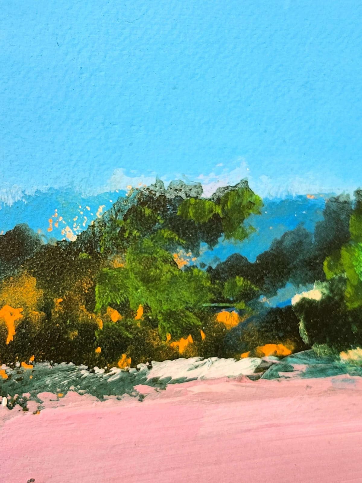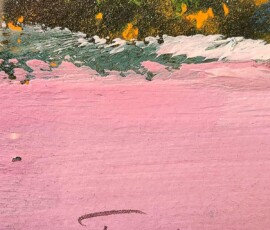 Il rosa magnetico, compatto, impreziosito da pennellate appena più corpose, trova un corrispettivo della stessa brillantezza proprio nel cielo azzurrissimo e terso.