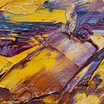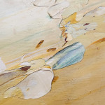 Le venature e la ruvidezza del legno vengono riscaldate dalla scelta cromatica fatta da Scatizzi che è riuscito a modulare anche la componente disegnativa in relazione alle assi del legno che non combaciano tra loro.
