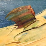 Le venature e la ruvidezza del legno vengono riscaldate dalla scelta cromatica fatta da Scatizzi che è riuscito a modulare anche la componente disegnativa in relazione alle assi del legno che non combaciano tra loro.